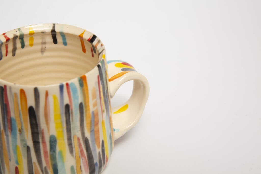 This delightful porcelain mug is wheel thrown and hand-painted with strokes of color and gold luster. It is food safe but not dishwasher safe. It measures 2 3/4" in diameter plus a 1" handle and is 3" tall.